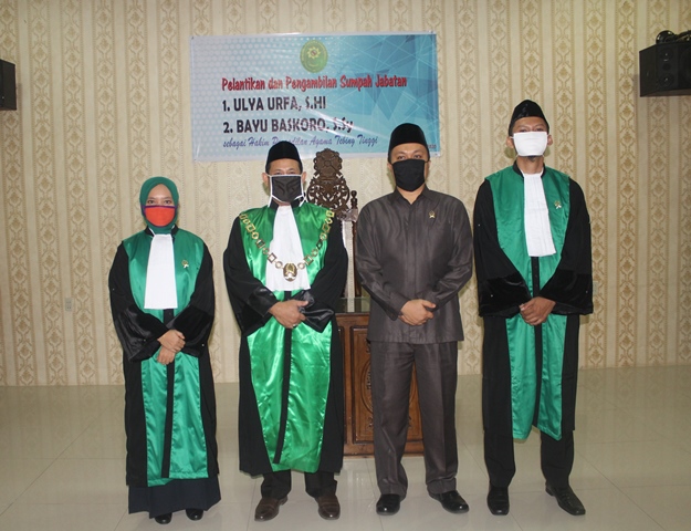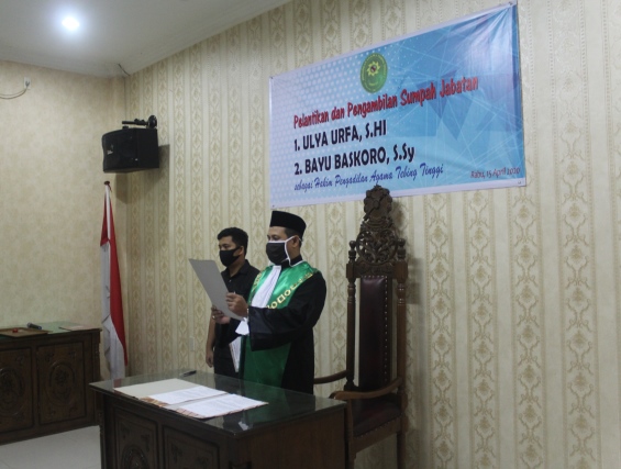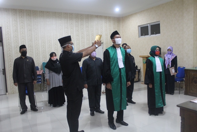 Tebing Tinggi. Rabu,15 April 2020. Ketua Pengadilan Agama Tebing Tinggi, A. Syarkawi, S.Ag., M.H., melantik 2 (dua) orang Hakim PA Tebing Tinggi. Acara pelantikan dan sumpah jabatan tersebut dilaksanakan di ruang rapat pengadilan dan diikuti oleh petugas pelantikan saja serta Wakil Ketua Pengadilan Agama Tebing Tinggi dikarenakan adanya virus COVID-19.