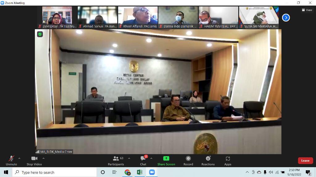 Tebing Tinggi. Rabu, 18 Mei 2022. Ketua Pengadilan Agama Tebing Tinggi (Dr, Hj. Devi Oktari, S. HI., M.H.) hari ini mengikuti Acara Penutupan Diklat Pelatihan Teknis Yudisial Bukti Elektronik bagi Hakim Peradilan Umum dan Peradilan Agama Tahap Kedua secara virtual.