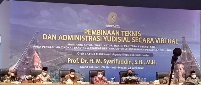 Medan. Kamis, 23 Juni 2022. Pengadilan Agama Tebing Tinggi mengikuti Pembinaan Bidang Teknis dan Administrasi Yudisial. Pembinaan dilaksnakan di Hotel JW Marriot Medan pada pukul 14.00 Wib. Pembinaan dilaksanakan dengan narasumber Ketua Mahkamah Agung Republik Indonesia Yang Mulia Prof. Dr. Muhammad Syarifuddin, S.H., M.H. Dilanjutkan oleh Panitera Mahkamah Agung RI, Sekretaris Mahkamah Agung RI, Dirjen Badilum Mahkamah Agung RI, Dirjen Badimiltun Mahkamah Agung RI, KaBawas Mahkamah Agung RI, KaBalitbangdiklatkumdil dan Dirjen Badilag Mahkamah Agung RI. Pembinaan diikuti langsung oleh Wakil Ketua (Nusra Arini, S.HI., M.H) dan Paniter (Drs. Andayany, S.H) Pengadilan Agama Tebing Tinggi.