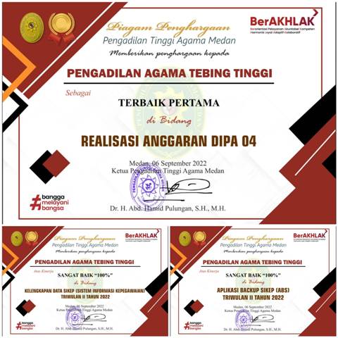 Kemudian dilanjutkan dengan Pemberian peghargaan kepada seluruh Pengadilan Agama Se-Sumatera Utara. Pengadilan Agama Tebing Tinggi mendapatkan 3 Penghargaan yaitu: