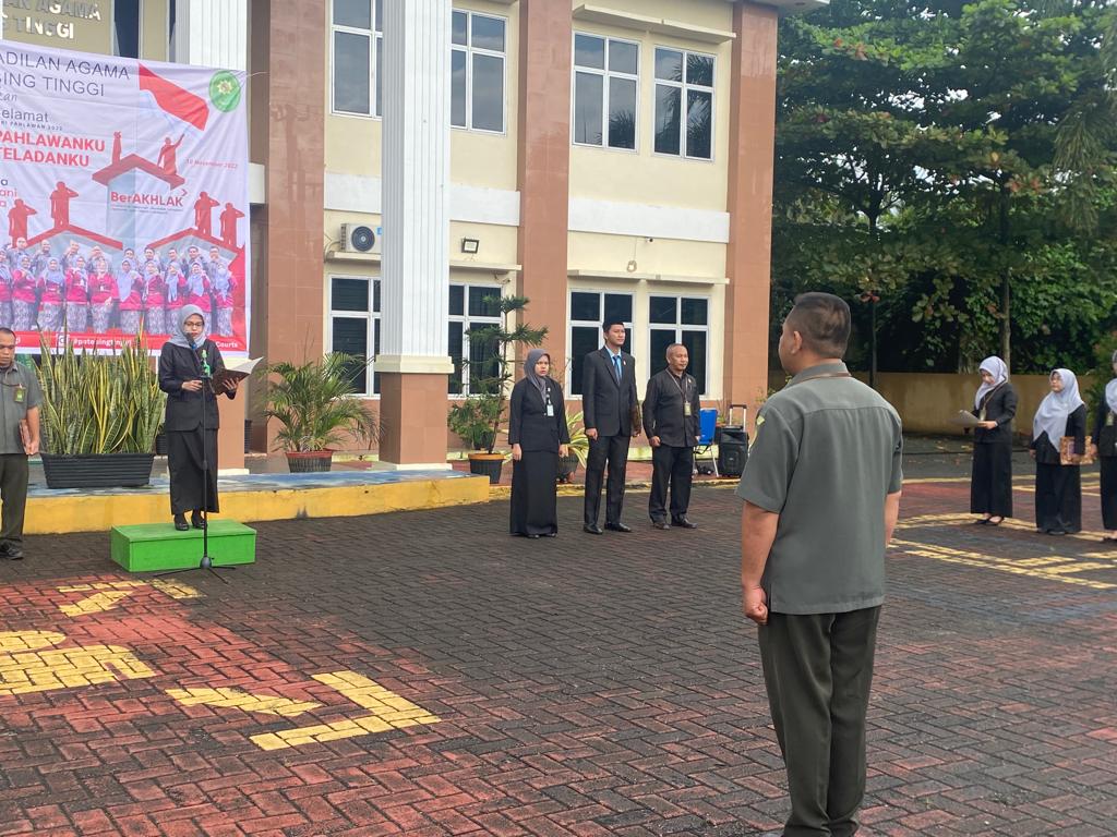 Wakil Ketua Pengadilan Agama Tebing Tinggi, Nusra Arini, S.H.I., M.H memimpin upacara Hari Pahlawan, Kamis (10/11/2022) di halaman depan kantor PA Tebing Tinggi. Instruksi ini berdasarkan surat Sekretaris Mahkamah Agung RI tanggal 8 Nopember 2022, tentang Upacara Peringatan Hari Pahlawan Tahun 2022. Upacara ini dihadiri oleh seluruh pegawai PA Tebing Tinggi.