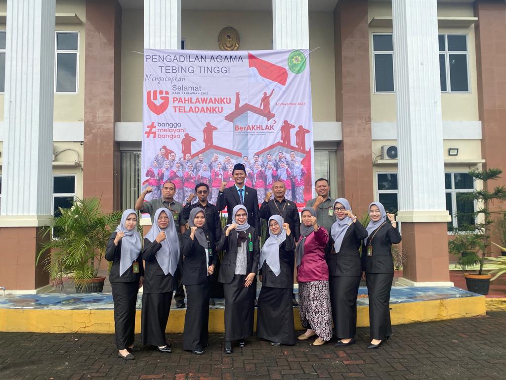 Tema pelaksanaan peringatan Hari Pahlawan Tahun 2022 adalah “Pahlawanku Teladanku”. Menteri Sosial Republik Indonesia mengamanatkan agar Mengisi kemerdekaan dengan menjadi Pahlawan yang dimulai dari diri sendiri, keluarga, lingkungan sekitar dan seterusnya. Jadikanlah semangat dan nilai–nilai Kepahlawanan sebagai inspirasi dalam setiap langkah hidup dan kehidupan kita Bersama dan Ayo kita berantas kebodohan, perangi kemiskinan dan upaya pecah–belah Bangsa untuk mewujudkan masyarakat adil dan makmur. Kita lawan paham radikal, kita tumbuh kembangkan semangat gotong royong untuk menyongsong masa depan yang cerah. PA Tebing Tinggi mengucapkan Selamat Hari Pahlawan Tahun 2022. “Hanya Bangsa yang menghargai jasa pahlawannya yang dapat menjadi bangsa yang besar”. (ITPAttd)